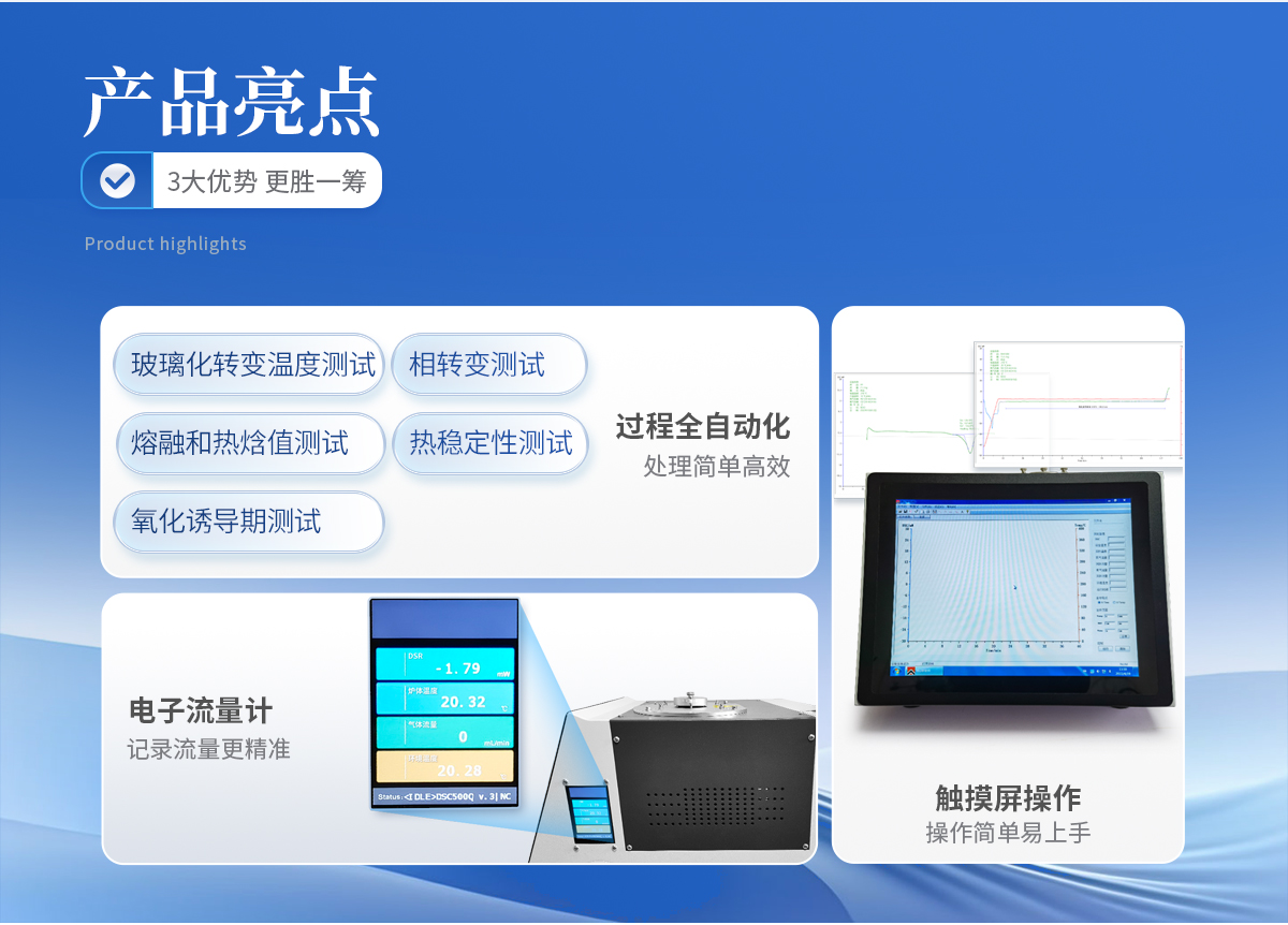 差示掃描量熱儀為觸摸屏式,可進(jìn)行玻璃化轉(zhuǎn)變溫度測試、相轉(zhuǎn)變測試、熔融和熱焓值測試、產(chǎn)品穩(wěn)定性、氧化誘導(dǎo)期測試。