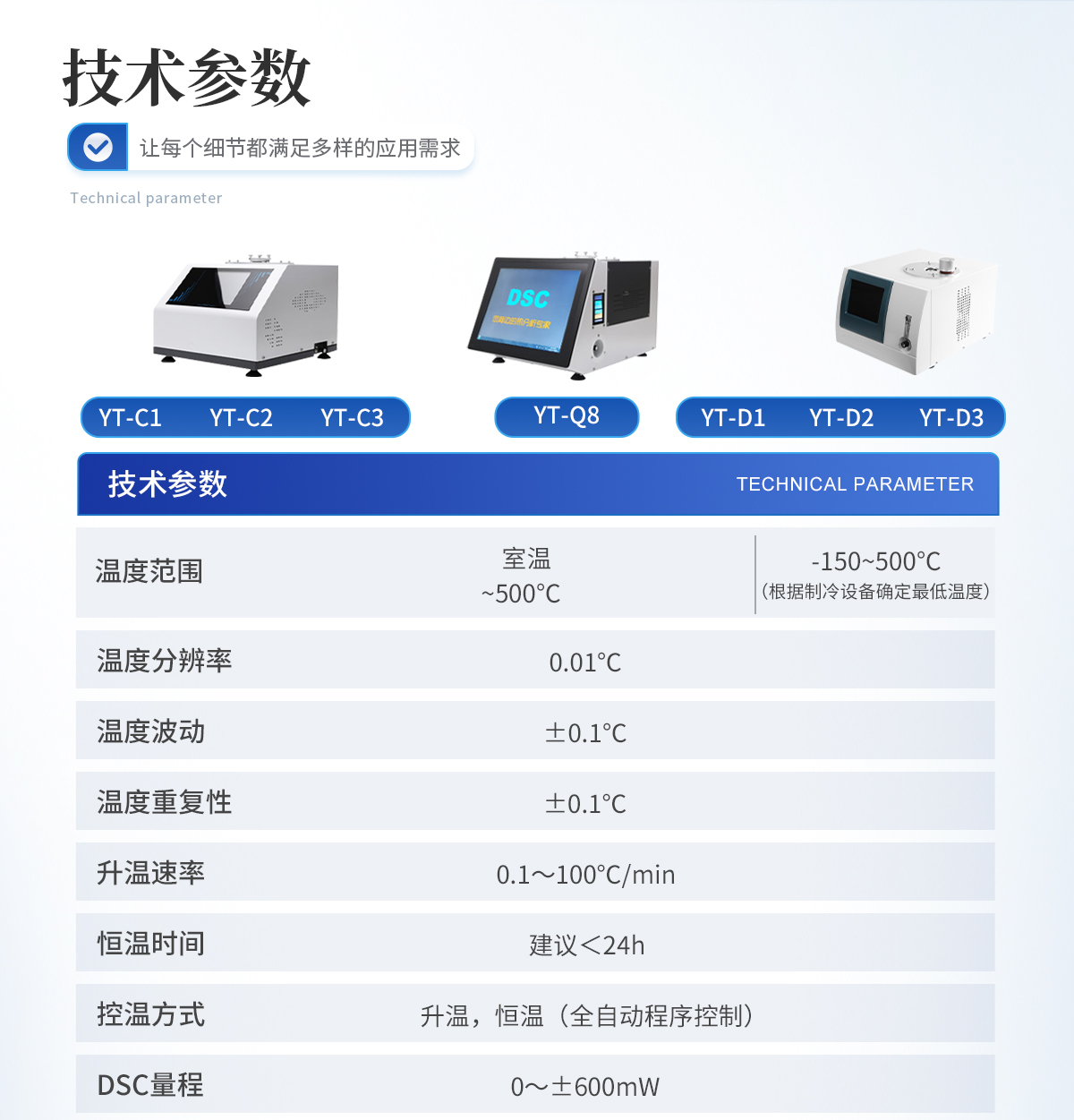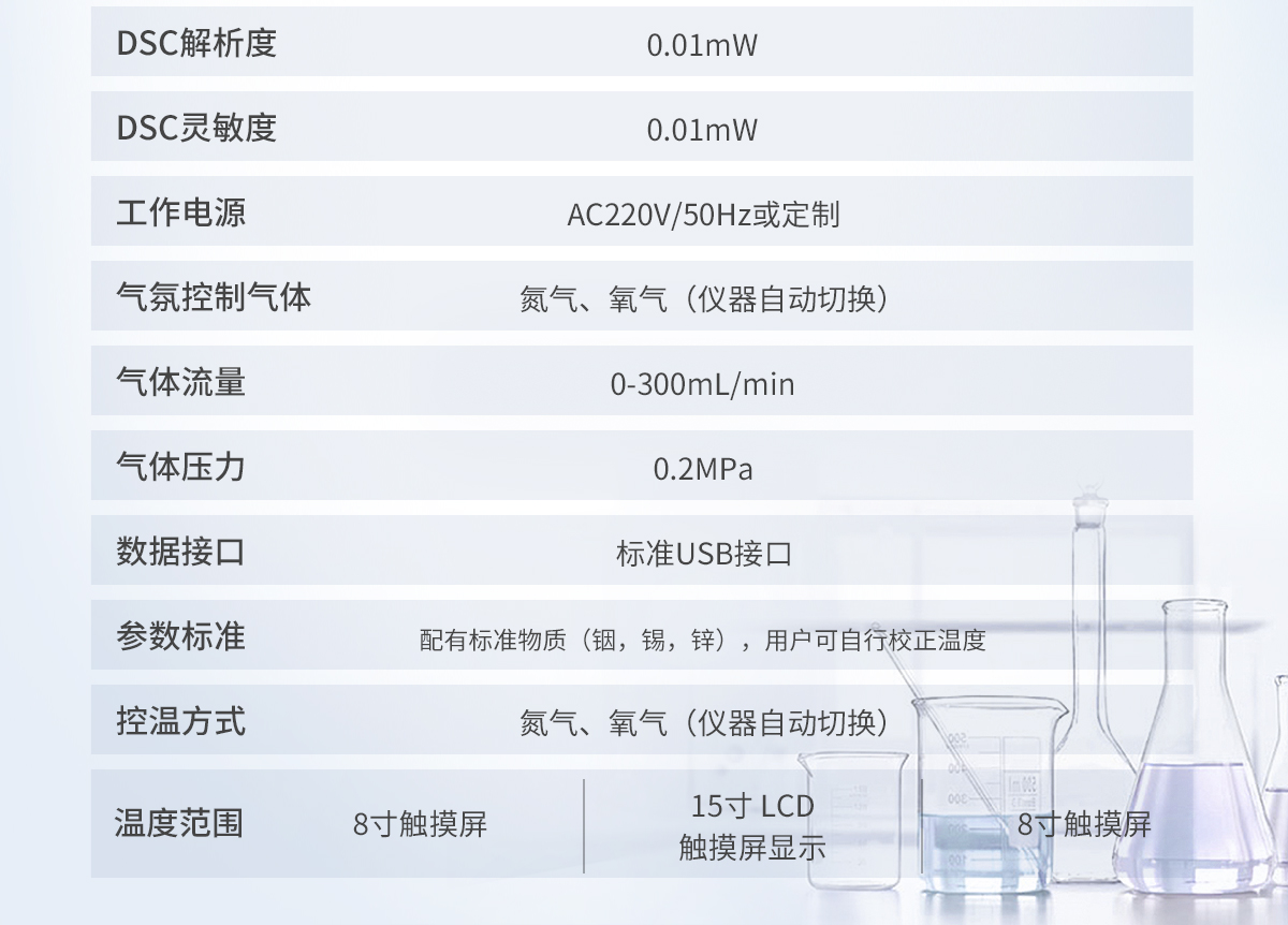 1.溫度范圍: -150~500℃ (根據(jù)制冷設(shè)備確定**溫度) 2.溫度分辨率: 0.01℃ 3.溫度波動(dòng): ±0.1℃ 4.溫度重復(fù)性: ±0.1℃ 5.升溫速率: 0.1~100℃/min 6.恒溫時(shí)間:建議<24h 7.控溫方式:升溫,恒溫(全自動(dòng)程序控制) 8.DSC量程: 0~±600mW 9.DSC解析度: 0.01mW 10.DSC靈敏度: 0.01mW 11.工作電源: AC220V/50Hz或定制 12.可選冷卻設(shè)備: - 壓縮空氣冷卻(-AR):RT ... 500℃ - 機(jī)械制冷(-MR): -40 ... 500℃ - 液氮制冷(-LN):-150 ... 500℃ (可以單獨(dú)或同時(shí)連接多種冷卻裝置) 13. 氣氛控制氣體:氮?dú)狻⒀鯕猓▋x器自動(dòng)切換) 14.氣體流量:0-300mL/min 15.氣體壓力:0.2MPa 16.顯示方式: 24bit色,8寸 LCD觸摸屏顯示 17.數(shù)據(jù)接口:標(biāo)準(zhǔn)USB接口 18.參數(shù)標(biāo)準(zhǔn): 配有標(biāo)準(zhǔn)物質(zhì)(銦,錫,鋅),用戶可自行校正溫度