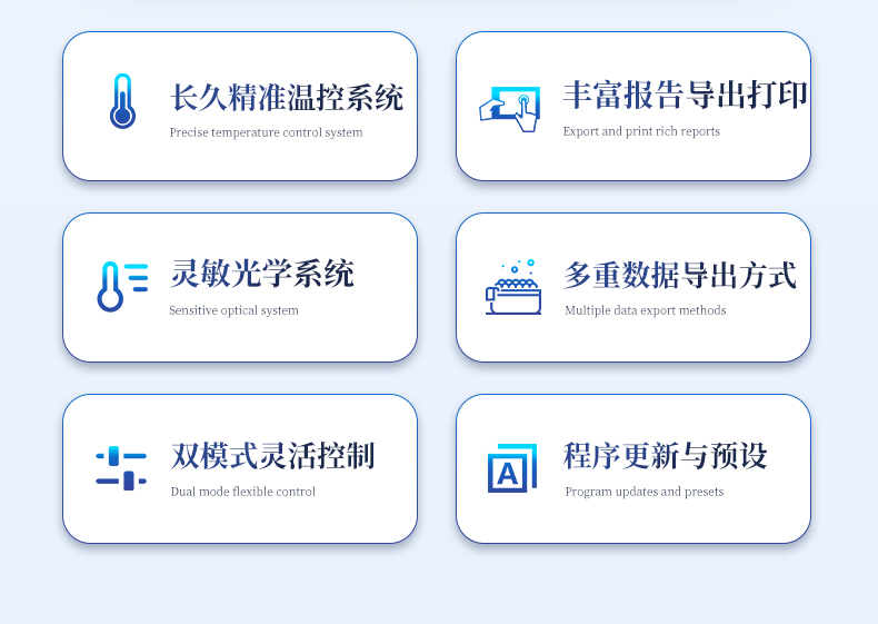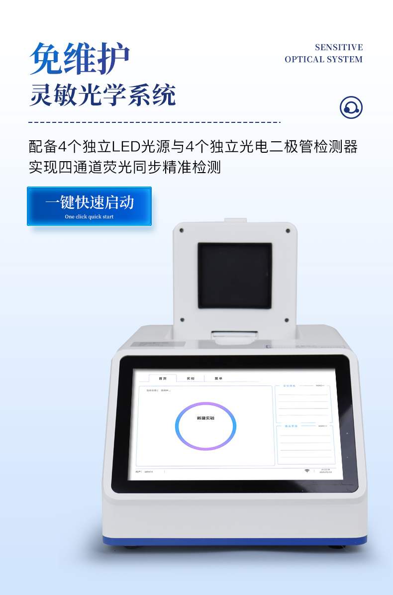 | 1.智能操作系統(tǒng),實驗盡在掌握 | A程序更新與預(yù)設(shè):支持在線更新實驗程序,并內(nèi)置豐富的預(yù)設(shè)實驗程序模板,用戶亦可自定義保存常用模版,實現(xiàn)一鍵快速啟動,極大提升操作效率。 | B操作簡單:無論是觸摸屏界面還是電腦軟件,均設(shè)計得直觀易懂,新用戶也能快速上手。預(yù)置常用程序模板,進一步簡化操作流程。 | 2.精準(zhǔn)穩(wěn)定的溫控與光學(xué)核心 | A長久精準(zhǔn)的溫控系統(tǒng):采用進口***TEC半導(dǎo)體制冷模塊,控溫精準(zhǔn)(±0.1°C),孔間溫度均勻性**(≤±0.3°C)。系統(tǒng)穩(wěn)定性卓越,長期使用性能衰減小,校準(zhǔn)周期長達數(shù)年,顯著降低維護成本與運營中斷。 | B免維護的靈敏光學(xué)系統(tǒng):配備單個獨立LED光源與單個獨立光電二極管檢測器,采用超長壽命進口光源,設(shè)計壽命期內(nèi)免維護,無需額外校準(zhǔn)或更換,保障檢測結(jié)果長期一致性與高靈敏度。 | C卓越的數(shù)據(jù)質(zhì)量:實驗線性相關(guān)性高(R2≥0.999),重復(fù)性優(yōu)異(孔間CV值低),確保定量結(jié)果準(zhǔn)確可靠,數(shù)據(jù)置信度高。 | 3.**便捷的數(shù)據(jù)與輸出管理 | A多重數(shù)據(jù)導(dǎo)出方式:支持通過USB存儲設(shè)備直接拷貝,或經(jīng)由Wi-Fi無線網(wǎng)絡(luò)傳輸數(shù)據(jù)至本地服務(wù)器或云端,方便靈活,滿足各類實驗室數(shù)據(jù)管理習(xí)慣。 | B豐富的報告導(dǎo)出與打?。褐С稚刹?dǎo)出多種格式(如PDF、Excel)的實驗報告。儀器兼容USB熱敏打印機、藍牙無線打印機及常規(guī)A4打印機,可直接在儀器上或通過電腦一鍵導(dǎo)出并打印專業(yè)報告,便于結(jié)果存檔與即時分享。 | 4.快速**與堅固耐用 | A升降溫速度快:優(yōu)化設(shè)計的溫控系統(tǒng)具備高速升降溫能力,顯著縮短單次循環(huán)與整體檢測時間,提升實驗通量。 | B超長使用壽命:核心部件均選用工業(yè)級耐用材料與設(shè)計,整機運行穩(wěn)定可靠,致力于為用戶提供長久的投資回報。 |