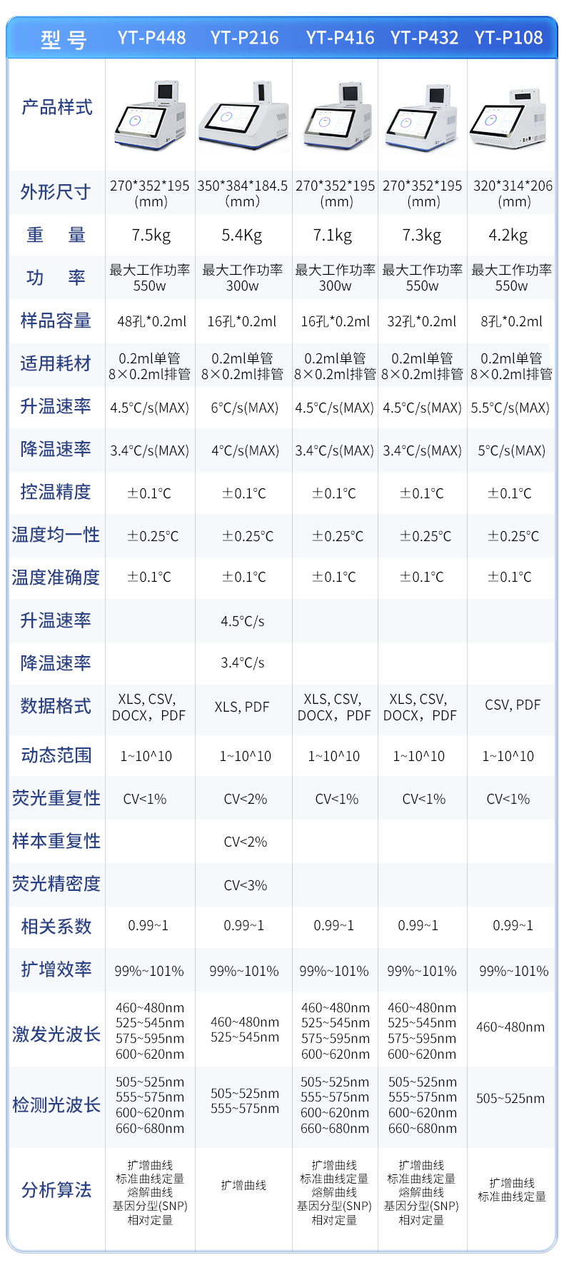 | 基本性能 | 外形尺寸:320*314*206 (mm) | 重量:4.2kg | 電源:220V | 功率:**工作功率550w | 操作系統(tǒng):自帶Android操作系統(tǒng) | 系統(tǒng)語言:中英文實時切換 | 操作環(huán)境參數(shù) | 操作環(huán)境溫度:18~35℃ | 操作環(huán)境相對濕度:0%~85% | 運輸及儲存溫度:-20~55℃ | 運輸及儲存相對濕度:0%~85% | 系統(tǒng)性能 | 樣品容量:8孔*0.2ml | 樣品容積:15~100ul | 適用耗材:0.2ml單管、8×0.2ml排管 | 控溫范圍:4~99℃ | 熱蓋溫度:30℃-108℃(默認(rèn)105℃,熱蓋溫度可調(diào)) | 溫控方式:高性能進口半導(dǎo)體 | 升溫速率:5.5℃/s(MAX) | 降溫速率:5℃/s(MAX) | 控溫精度:±0.1℃ | 溫度均一性 :±0.25℃ | 溫度準(zhǔn)確度 :±0.1℃ | 操作功能:預(yù)設(shè)項目和分析參數(shù),操作簡單方便 | 報告:支持報告自定義模塊 | 斷電保護:可以一鍵重啟中斷的實驗 | 儀器信息:擁有故障記錄,分析,提示的功能,更方便遠程解決問題 | 分析算法:擴增曲線,標(biāo)準(zhǔn)曲線定量 | 支持HRM檢測:支持 | 數(shù)據(jù)導(dǎo)出:可將實驗結(jié)果以圖形和表格的形式直接導(dǎo)出;詳細的數(shù)據(jù)報告內(nèi)容包括實驗條件,數(shù)據(jù)坐標(biāo)和表格,數(shù)據(jù)分析參數(shù)。 | 數(shù)據(jù)格式:CSV, PDF | TouchDown功能:支持時間和溫度遞增遞減模式 | 熒光檢測系統(tǒng)性能 | 檢測靈敏度:可檢測單拷貝基因 | 動態(tài)范圍:1~10^10 | 熒光重復(fù)性 :CV<1%(使用某品牌試劑做8孔均一性實驗,8個孔的ct差值保持在0.5以內(nèi),cv保持在1%以內(nèi)。)<> | 相關(guān)系數(shù):0.99~1(每種濃度3個重復(fù),梯度曲線的相關(guān)系數(shù)>0.99,擴增效率保持在99%~101%之間) | 擴增效率:99%~101% | 可信度:區(qū)分1000與2000拷貝濃度差異 | 激光光源:大功率LED(免維護,壽命長) | 檢測器:高靈敏度光電傳感器 | 激發(fā)和檢測傳播介質(zhì):耐高溫專業(yè)導(dǎo)光光纖 | 激發(fā)光波長: 460nm~480nm | 檢測光波長 :505nm~525nm |
