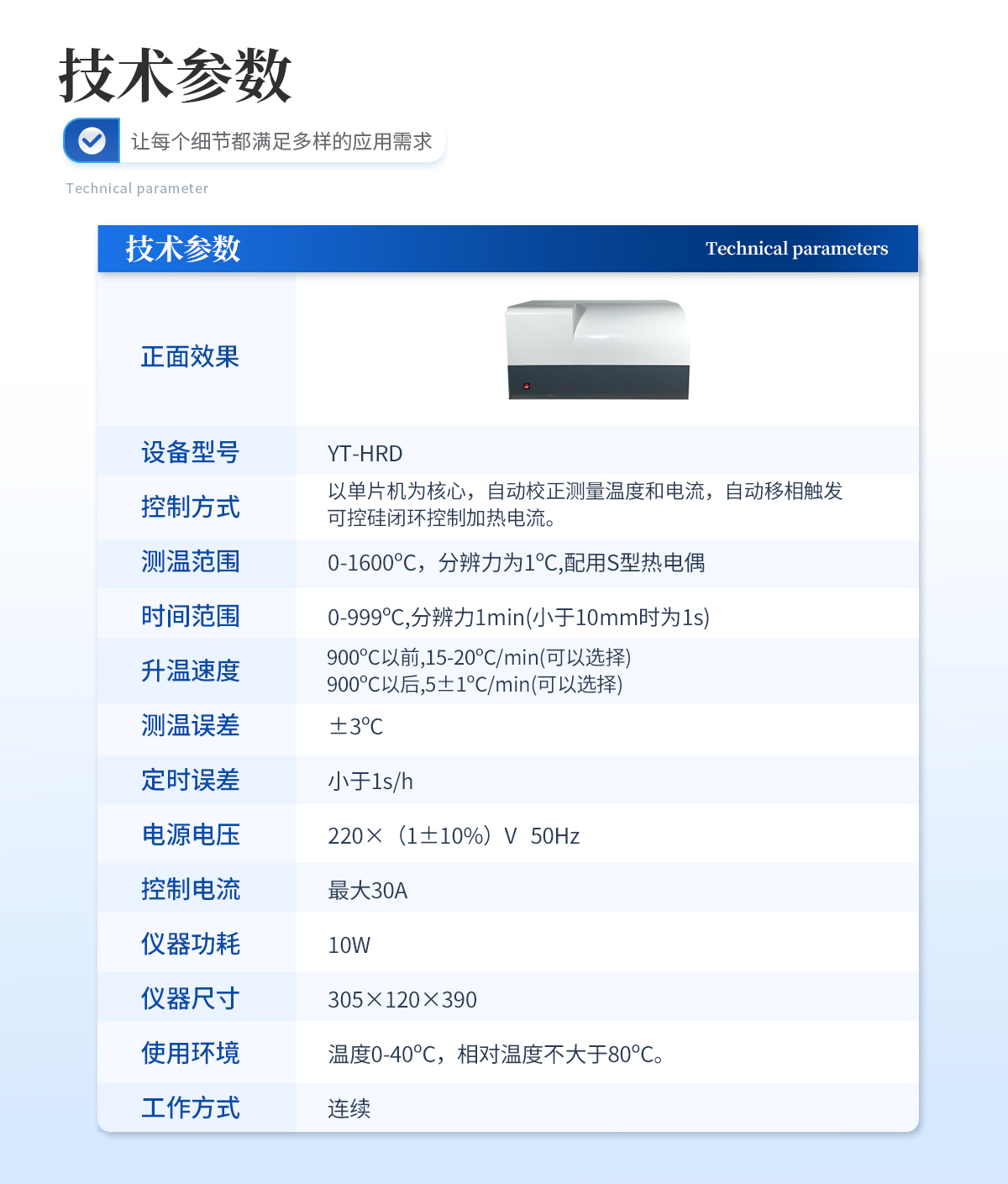 1、控制方式:以單片機為核心,自動校正測量溫度和電流,自動移相觸發(fā)可控硅閉環(huán)控制加熱電流。2、測溫范圍:0-1600oC,分辨力為1oC,配用S型熱電偶.3、時間范圍:0-999oC,分辨力1min(小于10mm時為1s)4、升溫速度:900oC以前,15-20oC/min(可以選擇).900oC以后,5±1oC/min(可以選擇)5、測溫誤差:±3oC6、定時誤差:小于1s/h7、電源電壓:220×(1±10%)V   50Hz8、控制電流:**30A9、儀器功耗:10W10儀器尺寸(mm):305×120×39011、使用環(huán)境:溫度0-40oC,相對溫度不大于80oC12、工作方式:連續(xù)