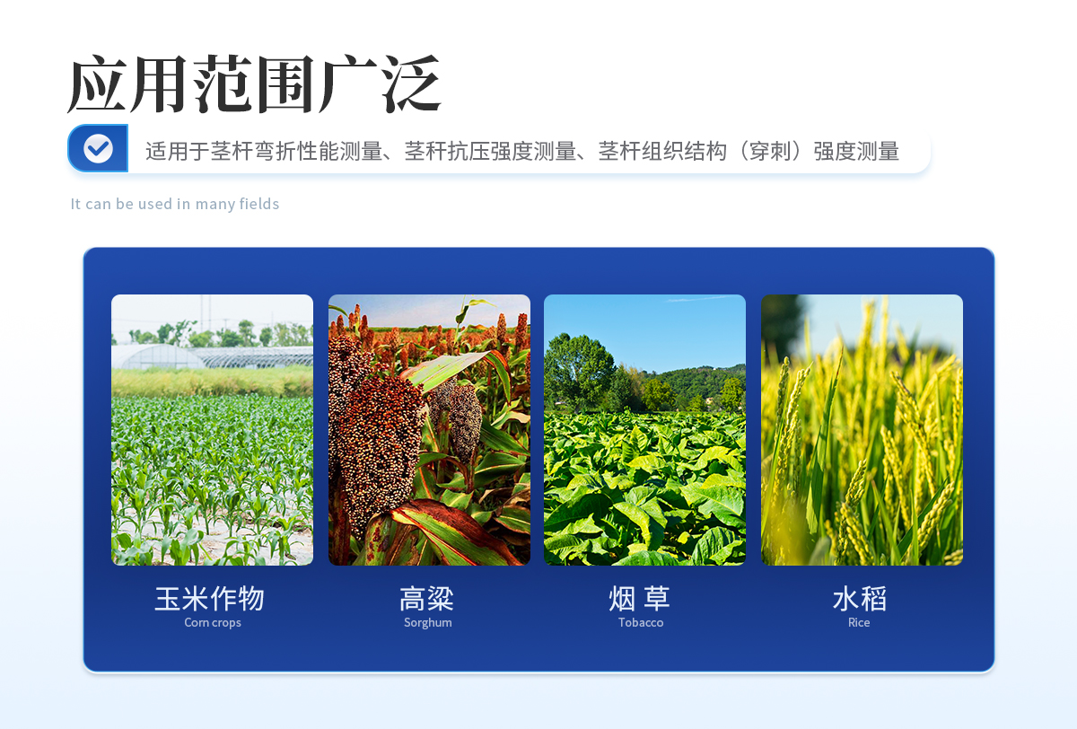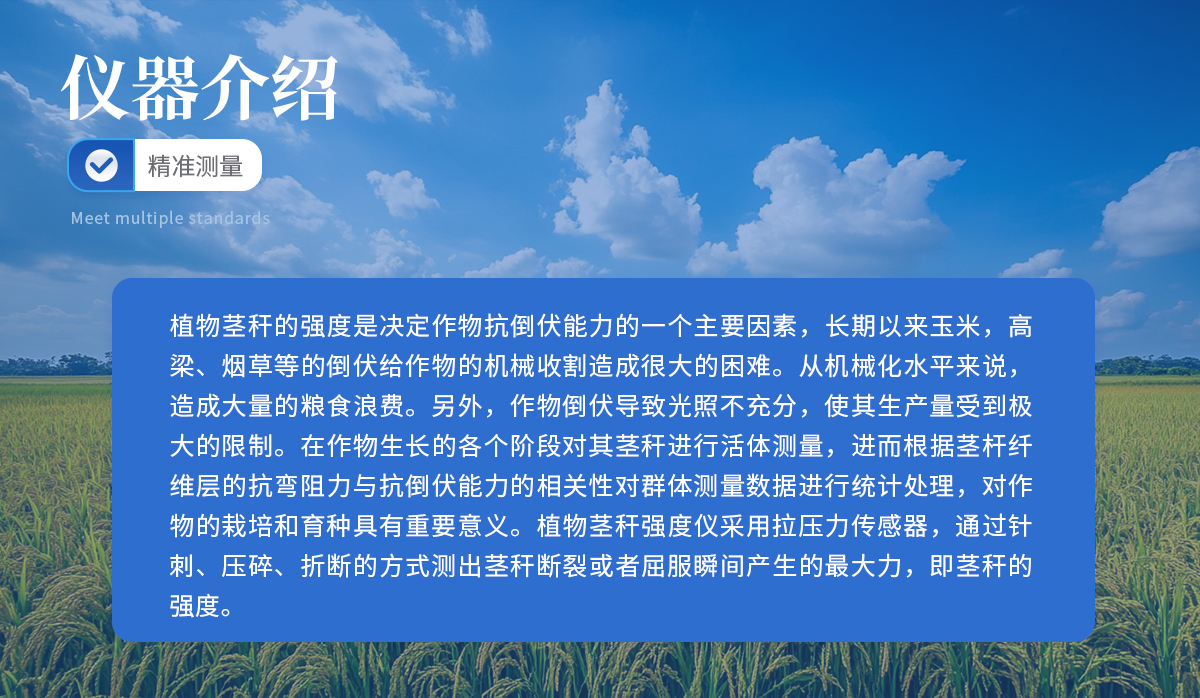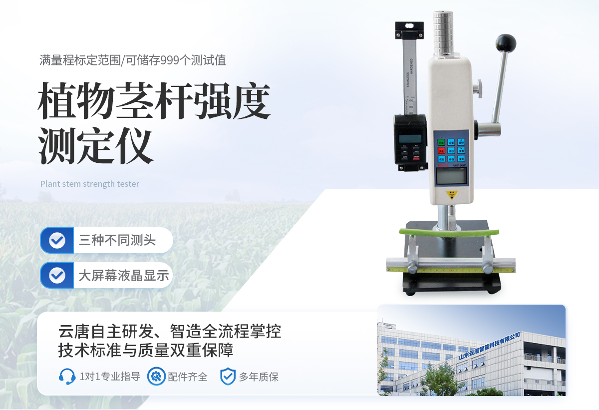 植物莖稈的強(qiáng)度是決定作物抗倒伏能力的一個(gè)主要因素,長(zhǎng)期以來(lái)玉米,高梁、煙草等的倒伏給作物的機(jī)械收割造成很大的困難。從機(jī)械化水平來(lái)說(shuō),造成大量的糧食浪費(fèi)。另外,作物倒伏導(dǎo)致光照不充分,使其生產(chǎn)量受到極大的限制。在作物生長(zhǎng)的各個(gè)階段對(duì)其莖稈進(jìn)行活體測(cè)量,進(jìn)而根據(jù)莖桿纖維層的抗彎阻力與抗倒伏能力的相關(guān)性對(duì)群體測(cè)量數(shù)據(jù)進(jìn)行統(tǒng)計(jì)處理,對(duì)作物的栽培和育種具有重要意義。植物莖稈強(qiáng)度儀采用拉壓力傳感器,通過(guò)針刺、壓碎、折斷的方式測(cè)出莖稈斷裂或者屈服瞬間產(chǎn)生的**力,即莖稈的強(qiáng)度