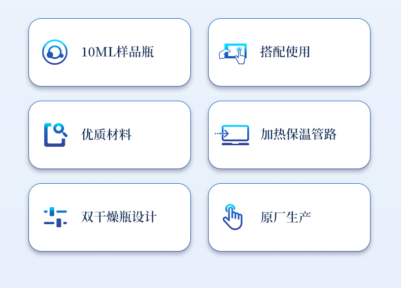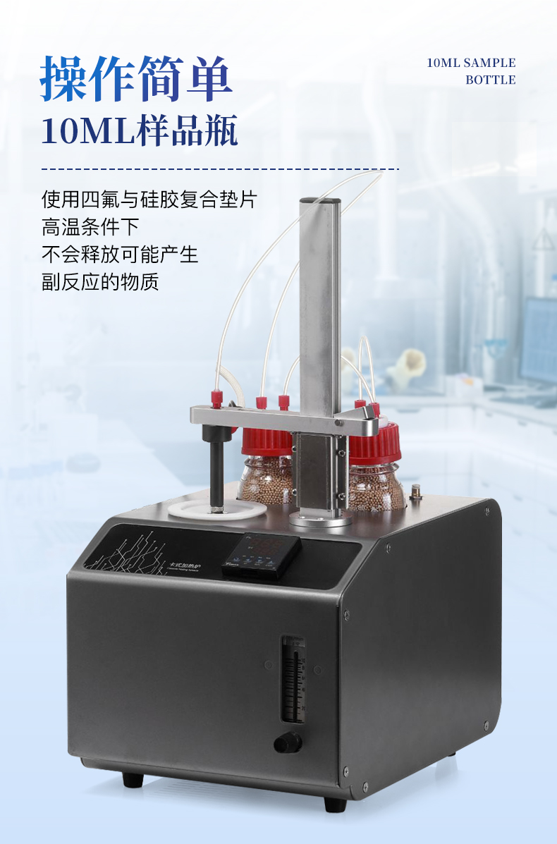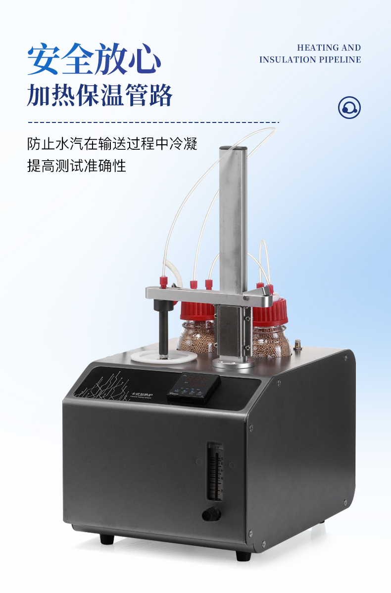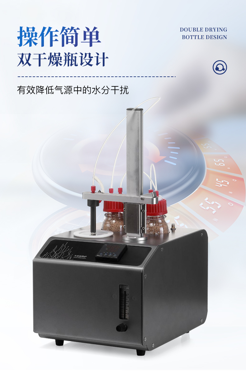 | 1、10ml樣品瓶:使用四氟與硅膠復合墊片,高溫條件下不會釋放可能產(chǎn)生副反應的物質(zhì) | 2、雙干燥瓶設計,有效降低氣源中的水分干擾 | 3、加熱保溫管路,防止水汽在輸送過程中冷凝,提高測試準確性 |