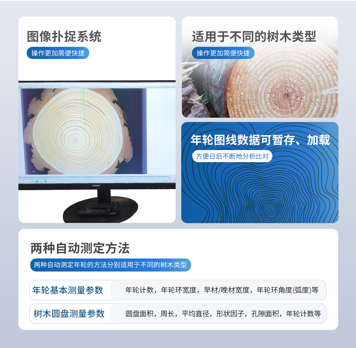 1、水平或垂直方向測量年輪、沿直線方向測量年輪(單節(jié))、年輪寬度測量、自動年輪監(jiān)測方式(強度不同)、忽略缺口部分、邊材寬度測量、估算丟失的年輪、以各種方向測量年輪、測量復(fù)雜形狀的樣品年輪(多節(jié))、添加相關(guān)年輪、早材晚材寬度測量、每環(huán)的反射光測量(**值、*小值、平均值、方向)、存儲*后部分年輪、可自定義一些參數(shù)(例如:名字、類型等)、圖像編輯、批量分析。 2、植物年輪測量分析: (1)可自動判讀年輪數(shù)、各年輪平均寬度、早材及晚材寬度、各年輪切向角度和面積、可自動劃分出年輪邊界、早材邊界、晚材邊界,以及識別出很窄的樹輪??山换h除偽年輪、插入斷年輪,亦可分析樹木圓盤面積,周長,平均直徑,形狀因子,孔隙面積,年輪技術(shù)等。 (2)可自動生成國際上通行的分析年表。分析獲得的測量數(shù)據(jù)具備進一步做交叉定年、數(shù)據(jù)分析處理能力。 (3)具有年輪圖線數(shù)據(jù)暫存、加載特性,以便日后不斷地分析比對。 (4)具有精細分析的“軟件體視鏡”特性。有路徑端點吸附定位特性,對不滿意的分析路徑還可斷開、刪除、增加與編輯,以及可將分析結(jié)果圖線保存。 (5)圖線上調(diào)整角度具有跟隨特性,畫路徑的時候可取消或刪除??芍苯臃治鲞_到1GB超高精度掃描的年輪圖像。具有對年輪寬度<0.2mm的極精細年輪的自動分析能力。 (6)可計算樹盤總面積??杀4婊蜃x取TIFF、BMP、PNG、JPEG標(biāo)準(zhǔn)格式的圖像。 3、系統(tǒng)自帶標(biāo)定功能、XY向可分別標(biāo)定修正。具有跟隨放大鏡功能,通過鼠標(biāo)拖動**測量。圖像可放大縮小和局部觀察,可實現(xiàn)鼠標(biāo)區(qū)域選擇統(tǒng)計。分析圖像、分布圖、結(jié)果數(shù)據(jù)可保存,分析結(jié)果輸出至Excel表,可輸出分析標(biāo)記圖。