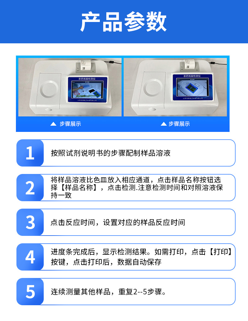| 乙酰膽堿酯酶和丁酰膽堿酯酶試劑均可以使用,符合國家標(biāo)準(zhǔn)和農(nóng)業(yè)部標(biāo)準(zhǔn)的要求。 | 自動(dòng)判斷樣品是否合格,檢測(cè)結(jié)果更加直觀。 | 儀器具有100多種蔬菜名稱菜單庫,分類管理,并可按需添加或刪除蔬菜名,編輯蔬菜名稱,可直接打印出蔬菜名稱。 | 檢測(cè)通道:10個(gè)檢測(cè)通道,可以同時(shí)測(cè)試多個(gè)樣品,循環(huán)檢測(cè),即放即檢,每個(gè)樣品由程序控制分別獨(dú)立工作,不會(huì)互相干擾。 | 智能操作系統(tǒng),采用更加人性化操作,主控采用多核處理器,主頻1.88Ghz,運(yùn)轉(zhuǎn)速度更快速,穩(wěn)定性更強(qiáng)。 | 顯示方式:7英寸高靈敏真彩觸摸屏顯示,人性化中文操作界面,讀數(shù)直觀、簡(jiǎn)單。 | 打印機(jī)采用串口5v打印,可選擇手動(dòng)打印或者自動(dòng)打印,三分鐘出打印結(jié)果,打印格式為檢測(cè)人姓名、吸光度差值、檢測(cè)時(shí)間、檢測(cè)機(jī)構(gòu)、樣品名稱及結(jié)果判定。 | 光源采用進(jìn)口超高亮發(fā)光二極管,具有低功耗、高精度、穩(wěn)定性強(qiáng)、光源可控可以關(guān)掉不使用的光源,響應(yīng)速度快等優(yōu)點(diǎn)。 | 智能恒流穩(wěn)壓,光強(qiáng)自動(dòng)校準(zhǔn),長(zhǎng)時(shí)間連續(xù)工作光源無溫漂現(xiàn)象。 | 儀器具有GPRS遠(yuǎn)傳功能,可插手機(jī)卡實(shí)現(xiàn)數(shù)據(jù)遠(yuǎn)傳平臺(tái),wifi聯(lián)網(wǎng)功能,可將數(shù)據(jù)快速上傳電腦,進(jìn)行數(shù)據(jù)管理與統(tǒng)計(jì)。 | 采用USB2.0接口設(shè)計(jì),方便數(shù)據(jù)的存貯和移動(dòng),并可隨時(shí)與計(jì)算機(jī)直接相連,并且可用計(jì)算機(jī)控制儀器。實(shí)現(xiàn)數(shù)據(jù)查詢、瀏覽、分析、統(tǒng)計(jì)、打印等。 | 智能化程度高,儀器具有自檢功能:具有開機(jī)自檢和調(diào)零功能,具有自動(dòng)檢測(cè)重復(fù)性功能 | 儀器具有自身保護(hù)功能,可設(shè)置用戶名及密碼,防止非工作人員操作等。 | 采用DC12v直流供電,安全系統(tǒng)更高,并且配備6A鋰電池充電器。 | 儀器具有重新校準(zhǔn)、鎖定、恢復(fù)出廠設(shè)置功能。 |