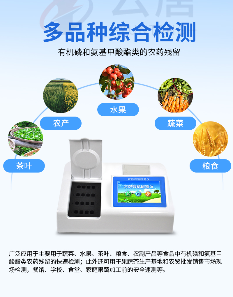 廣泛應(yīng)用于主要用于蔬菜、水果、茶葉、糧食、農(nóng)副產(chǎn)品等食品中有機(jī)磷和氨基甲酸酯類農(nóng)藥殘留的快速檢測(cè);此外還可用于果蔬茶生產(chǎn)基地和農(nóng)貿(mào)批發(fā)銷售市場(chǎng)現(xiàn)場(chǎng)檢測(cè),餐館、學(xué)校、食堂、家庭果蔬加工前的安全速測(cè)等。