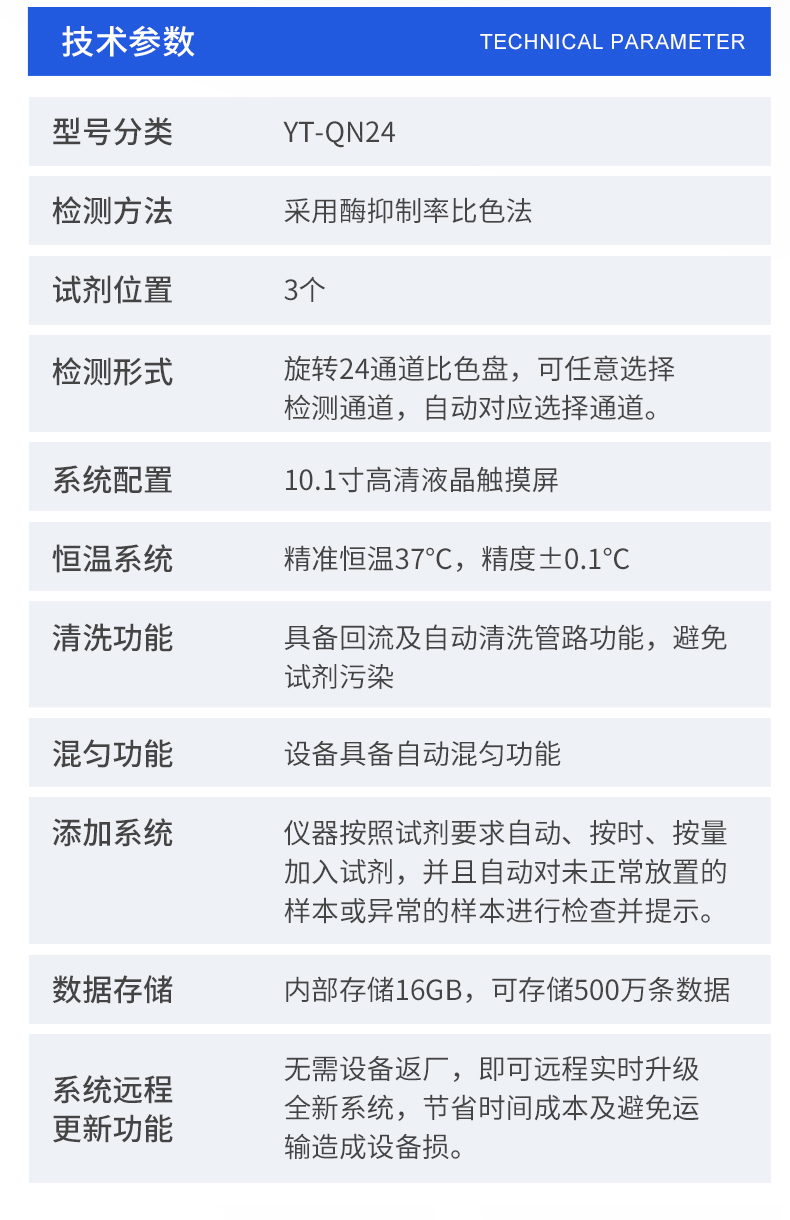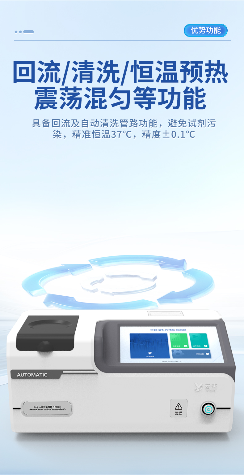 | 1. 試劑位置:3個 | 2. 檢測形式:旋轉(zhuǎn)24通道比色盤,可任意選擇檢測通道,自動對應(yīng)選擇通道。 | 3. 系統(tǒng)配置:10.1寸高清液晶觸摸屏,采用ARM Cortex?-A7,RK3288/4核處理器,運行內(nèi)存1GB。Android7.1.1 系統(tǒng)分辨率1280×800。 | 4.恒溫系統(tǒng):具有自動加溫溫控系統(tǒng),精準(zhǔn)恒溫37℃,精度±0.1℃。 | 5.添加系統(tǒng):儀器按照試劑要求自動、按時、按量加入試劑,并且自動對未正常放置的樣本或異常的樣本進行檢查并提示。 | 6.清洗功能:儀器具備回流及自動清洗管路功能,避免試劑污染。 | 7.混勻功能:設(shè)備具備自動混勻功能。 | 8.光源校準(zhǔn):設(shè)備可自動校準(zhǔn),確保檢測準(zhǔn)確度。 | 9.實時監(jiān)控:儀器測試過程中屏幕顯示運行狀態(tài),可實時查看。 | 10.數(shù)據(jù)存儲:內(nèi)部存儲16GB,可存儲500萬條數(shù)據(jù)。 | 11.樣品多選功能:設(shè)備具備樣品一鍵多選功能,選擇樣品自動匹配檢測通道。 | 12.項目預(yù)設(shè):可提前設(shè)置單個及多個相同或不相同的檢測任務(wù),可單次或者多次調(diào)取,減少檢測時間。 | 13.自定義打印系統(tǒng):內(nèi)置自定義打印系統(tǒng),可按需靈活設(shè)置開啟或關(guān)閉:產(chǎn)品合格證(國家農(nóng)業(yè)部標(biāo)準(zhǔn)),二維碼,抽樣信息、檢測信息,受檢信息等信息的打印。 | 14.A4版本報告打印功能:設(shè)備可自動生成A4版報告,A4報告帶二維碼,可掃描二維碼生成電子版,并可識別真?zhèn)巍?/td> | 15.傳輸方式:儀器配備無線通信模塊: 4G(APN)通訊模塊、Wifi模塊,藍牙傳輸模塊,同時具有USB接口以及RJ45接口能以多種方式實現(xiàn)數(shù)據(jù)保存和數(shù)據(jù)傳輸功能,設(shè)備數(shù)據(jù)可以同步上傳至平臺。 | 16.數(shù)據(jù)監(jiān)管系統(tǒng):設(shè)備自帶監(jiān)管平臺,并可同步對接監(jiān)管平臺,數(shù)據(jù)可局域網(wǎng)和互聯(lián)網(wǎng)數(shù)據(jù)上傳,檢測結(jié)果可直接傳至食品安全監(jiān)管平臺。達到食品安全問題預(yù)估、預(yù)警。 | 17.系統(tǒng)遠程更新功能:無需設(shè)備返廠,即可遠程實時升級全新系統(tǒng),節(jié)省時間成本及避免運輸造成設(shè)備損。 |