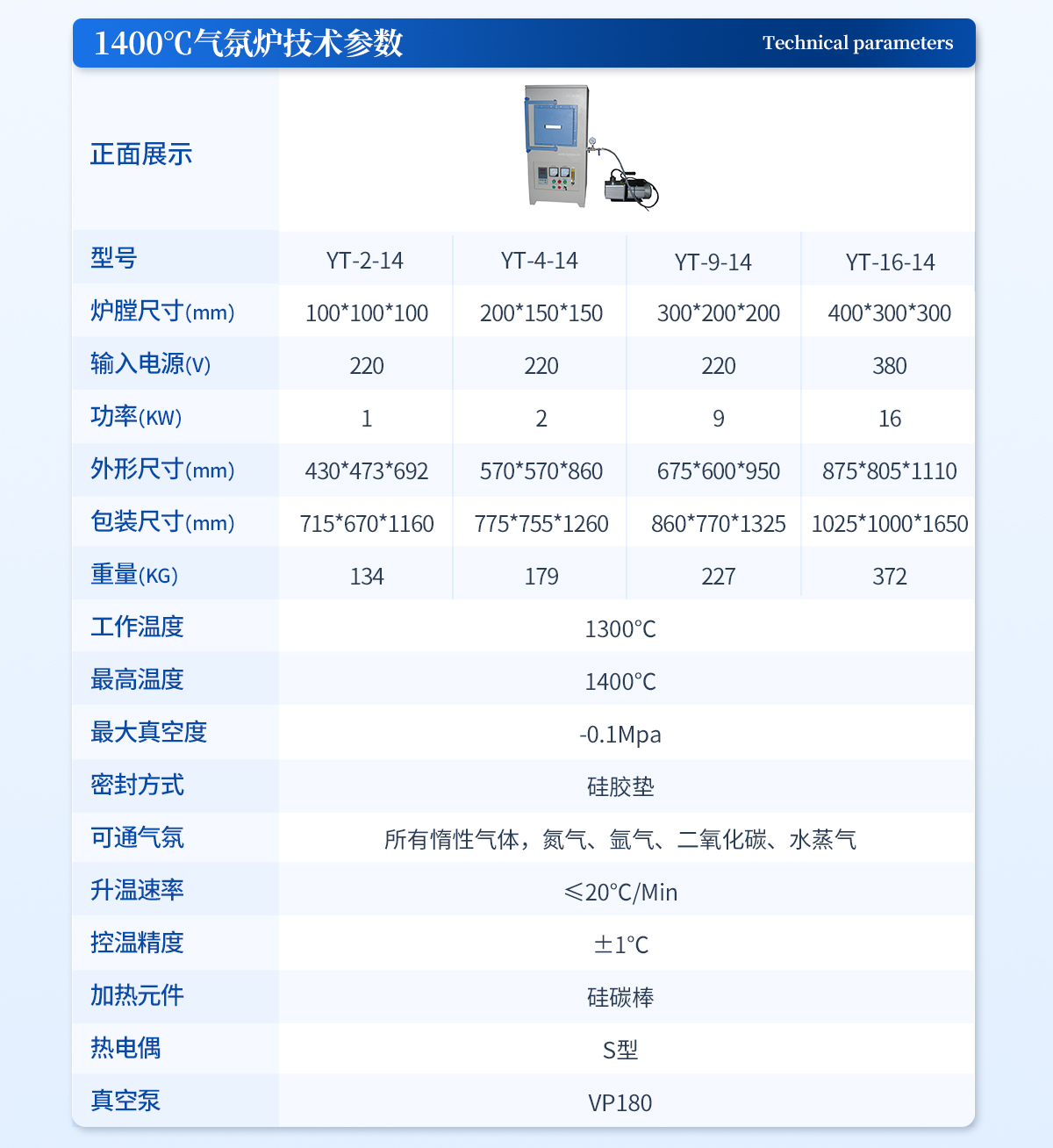 | 工作溫度:1300℃ | **溫度:1400℃ | **真空度:-0.1Mpa | 密封方式:硅膠墊 | 可通氣氛:所有惰性氣體,氮?dú)?、氬氣、二氧化碳、水蒸?/td> | 升溫速率:≤20℃/Min | 控溫精度:±1℃ | 加熱元件:硅碳棒 | 熱電偶:S型 | 工作電壓:220V 50HZ | 功率:1KW | 真空泵:VP180 |