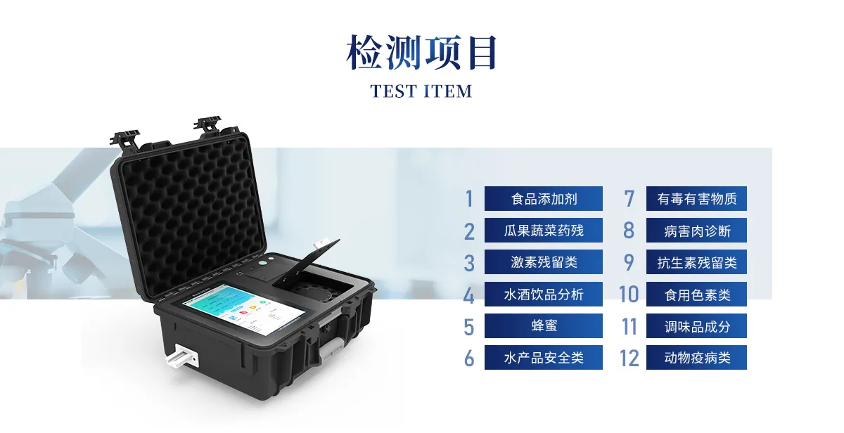 多功能食品安全檢測儀可快速檢測200多項(xiàng)目,包含非食用化學(xué)物質(zhì)、濫用食品添加劑、農(nóng)藥殘留、獸藥殘留、重金屬、病害肉、營養(yǎng)強(qiáng)化劑、抗生素類殘留、激素類殘留、真菌毒素類殘留、化學(xué)類殘留等現(xiàn)場的定性定量檢測。