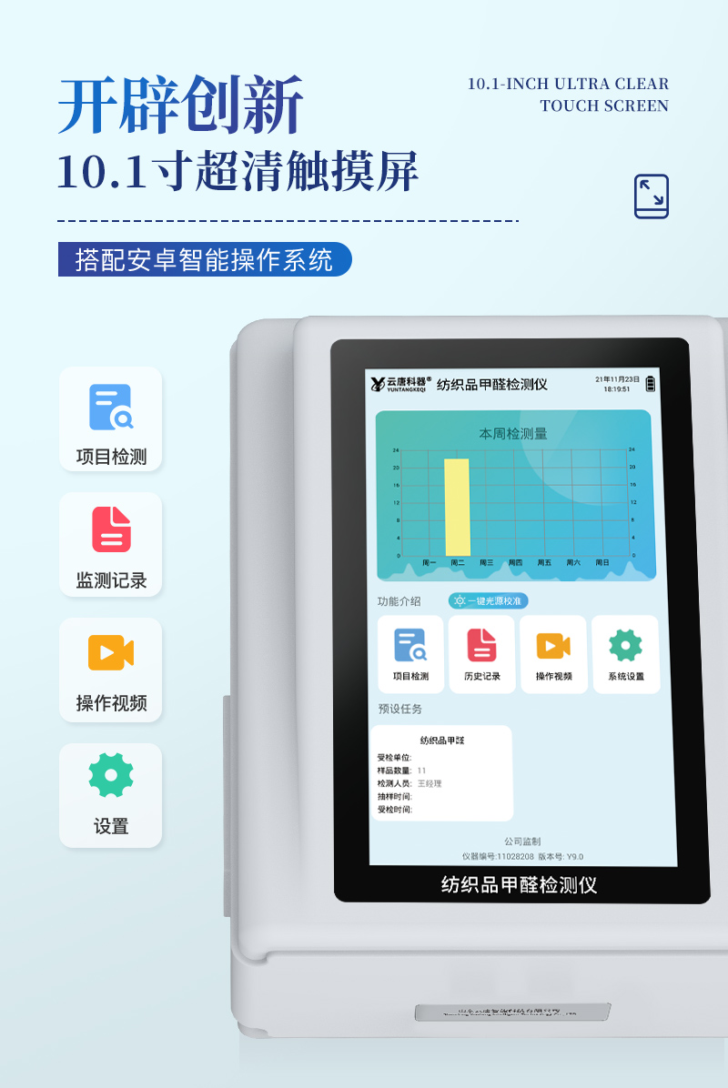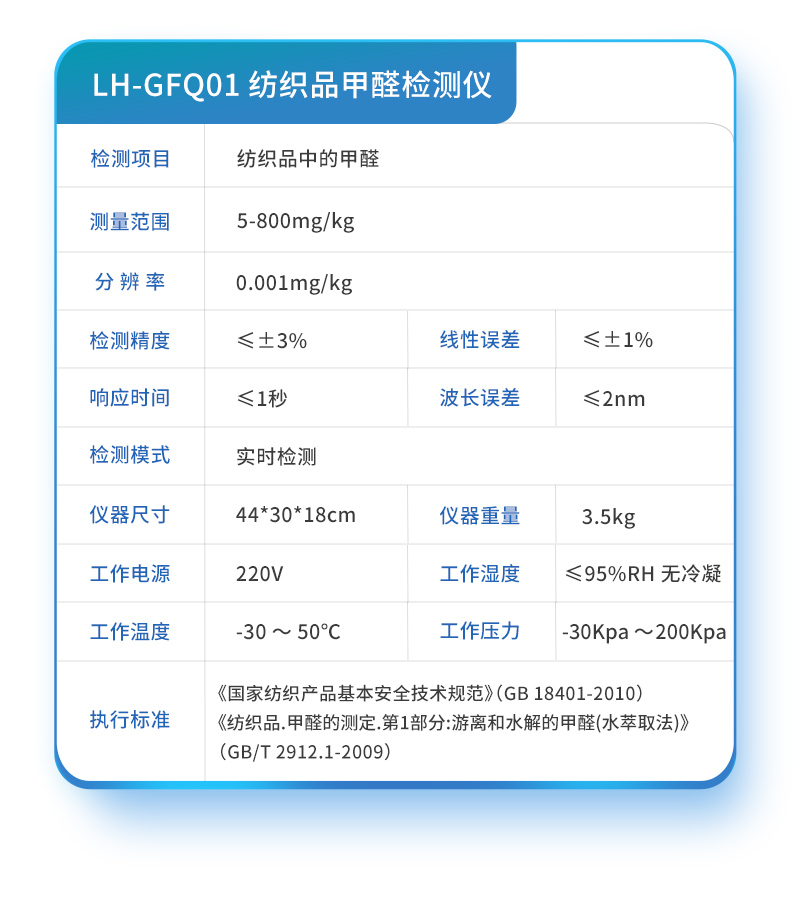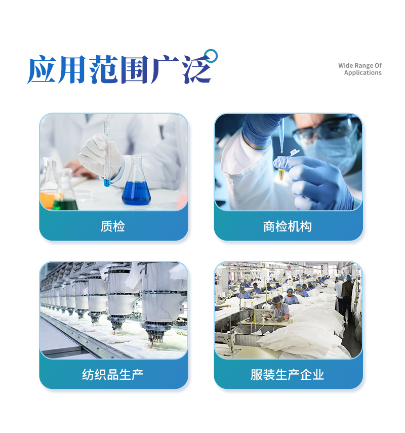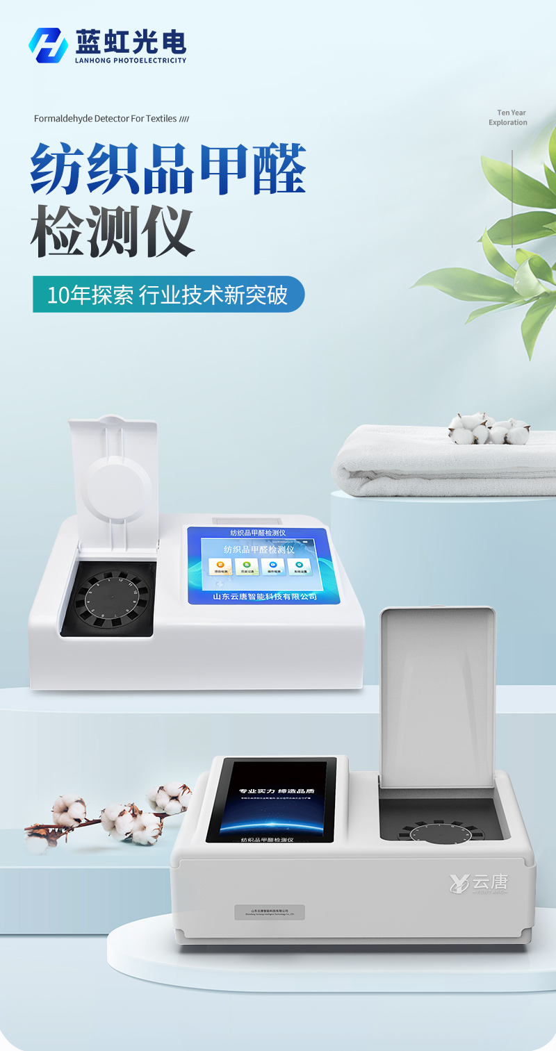 該紡織品甲醛檢測(cè)設(shè)備滿足紡織品甲醛含量檢測(cè)的中國(guó)標(biāo)準(zhǔn)《國(guó)家紡織產(chǎn)品基本安全技術(shù)規(guī)范》(GB 18401-2010)、《紡織品.甲醛的測(cè)定.第1部分:游離和水解的甲醛(水萃取法)》(GB/T 2912.1-2009), 適合各種紡織品、服裝等的甲醛含量檢測(cè)。