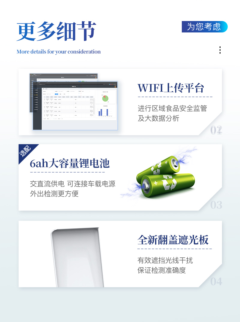 ⑦ 該儀器模塊化高度集成,同步設(shè)有數(shù)字化管理模塊、無線通訊模塊,可將檢測(cè)結(jié)果進(jìn)行分析,直接上傳至數(shù)據(jù)平臺(tái),實(shí)現(xiàn)數(shù)據(jù)共享,方便后期進(jìn)行數(shù)據(jù)分析與統(tǒng)計(jì)。