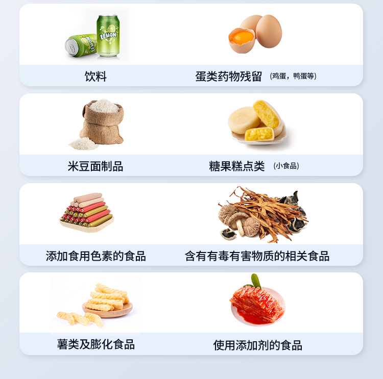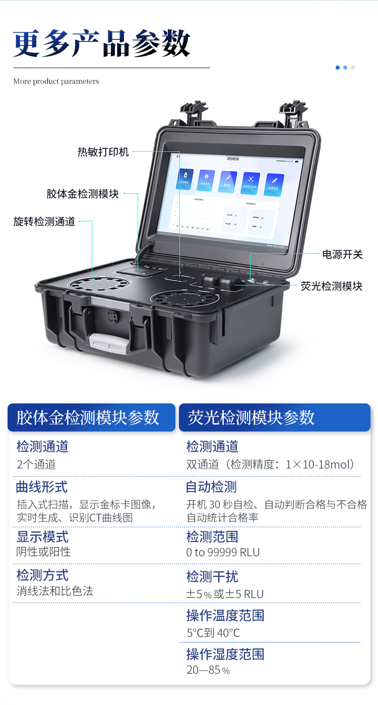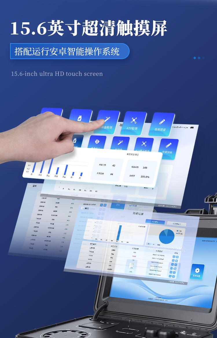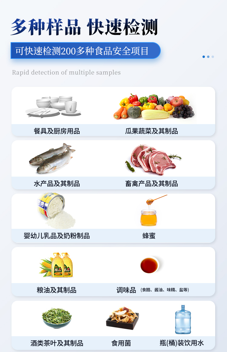 | 1. 功能構(gòu)成:主要包括分光光度模塊、新型農(nóng)殘檢測(cè)模塊、膠體金檢測(cè)模塊、熒光檢測(cè)模塊、數(shù)字化管理模塊等,所有模塊集成一體,可快速檢測(cè)200多種食品安全項(xiàng)目,如獸藥殘留、農(nóng)藥殘留、非法添加劑、細(xì)菌數(shù)值等指標(biāo)。 | 2. 檢測(cè)樣品種類:餐具及廚房用品、瓜果蔬菜及其制品、水產(chǎn)品及其制品、畜禽產(chǎn)品及其制品、嬰幼兒乳品及奶粉制品、蜂蜜、糧油及其制品、調(diào)味品(食醋、醬油、味精、鹽等)、酒類茶葉及其制品、食用菌、飲料、蛋類藥物殘留(雞蛋,鴨蛋等)、米豆面制品、糖果糕點(diǎn)類(小食品)、薯類及膨化食品、瓶(桶)裝飲用水、添加食用色素的食品、使用添加劑的食品、含有有毒有害物質(zhì)的相關(guān)食品。 | 3、顯示屏幕:儀器采用15.6英寸液晶觸摸屏顯,搭配運(yùn)行安卓智能操作系統(tǒng),主控芯片采用ARM Cortex-A7,RK3288/4核處理器,主頻1.88Ghz,操作方便,性能更強(qiáng)。 | 4、供電模式:儀器交直流兩用,直流12V供電,可連接車載電源,配18ah大容量充電鋰電池,電量可實(shí)時(shí)顯示,無外部電源條件下可持續(xù)工作至少 4 小時(shí)。 | 5、檢測(cè)通道:≥24通道;采用精密旋轉(zhuǎn)比色池設(shè)計(jì),使用同芯片同光源校準(zhǔn)精度,解決不同光源之間的誤差值,更加準(zhǔn)確**,采用高精度進(jìn)口四波長冷光源,每個(gè)通道均配置 410、520、590、630nm 波長光源,標(biāo)配**的光路切換裝置,專利光路切換功能可實(shí)現(xiàn)64波長,并且所有檢測(cè)項(xiàng)目可實(shí)現(xiàn)所有通道同時(shí)檢測(cè). | 6、通訊接口:配備無線通信模塊、4G(APN)通訊模塊、藍(lán)牙傳輸,同時(shí)具有雙USB接口以及RJ45網(wǎng)線接口,可以多方式實(shí)現(xiàn)數(shù)據(jù)保存及數(shù)據(jù)傳輸。 | 7、存儲(chǔ)方式:支持U盤存儲(chǔ),兩個(gè)標(biāo)準(zhǔn)USB接口,免驅(qū)動(dòng)安裝。檢測(cè)結(jié)果存儲(chǔ)容量20萬條以上,可生成Excel表格進(jìn)行拷貝,并具有登錄保護(hù)功能。 | 8、操作系統(tǒng):儀器可在同一檢測(cè)界面自動(dòng)對(duì)應(yīng)相關(guān)檢測(cè)通道,一次性選擇不少于11個(gè)樣品名稱,無需退出界面,節(jié)省操作時(shí)間。并可以對(duì)每個(gè)通道屬性和樣品信息單獨(dú)進(jìn)行編輯,例如送檢單位、人員,檢測(cè)人員等,打印時(shí)勾選打印顯示。 | 9、數(shù)據(jù)集成系統(tǒng):設(shè)備首頁自動(dòng)匯總分析檢測(cè)數(shù)據(jù),包含:周檢測(cè)數(shù)據(jù)、月檢測(cè)數(shù)據(jù),全部檢測(cè)總數(shù)量,包含檢測(cè)總數(shù),合格數(shù),不合格數(shù),以及相關(guān)柱形分析圖,各項(xiàng)檢測(cè)數(shù)據(jù)一目了然,無需電腦查詢,更加快捷直觀。 | 10、數(shù)據(jù)庫系統(tǒng):十幾項(xiàng)數(shù)據(jù)庫分類管理儀器:包含項(xiàng)目類型、項(xiàng)目數(shù)據(jù)、檢測(cè)數(shù)據(jù)、歷史記錄、國標(biāo)信息、曲線信息、采樣信息、檢測(cè)信息、受檢信息、復(fù)核信息、圖表信息、光源校準(zhǔn)信息、打印樣式信息、樣品庫信息等等,數(shù)據(jù)庫之間互相協(xié)調(diào)聯(lián)動(dòng)保證數(shù)據(jù)的真實(shí)完整性。同時(shí)產(chǎn)品數(shù)據(jù)庫以及歷史檢測(cè)記錄支持一鍵檢索功能。 | 11、限量規(guī)判系統(tǒng):具有限量查詢、添加物質(zhì)合規(guī)判定系統(tǒng)。檢測(cè)出結(jié)果后,系統(tǒng)自動(dòng)調(diào)用系統(tǒng)數(shù)據(jù)庫中相關(guān)國標(biāo)進(jìn)行比對(duì)判定,客觀顯示判定結(jié)果是否合格。 | 12、項(xiàng)目預(yù)設(shè)系統(tǒng):儀器具有任務(wù)預(yù)設(shè)模塊,一鍵提前預(yù)設(shè),給出方便快捷的新檢測(cè)方案,每一個(gè)任務(wù)分別可以設(shè)置不同的樣品、批次、編號(hào)、來源、備注、抽樣信息、檢測(cè)信息、受檢信息、復(fù)核信息等更多信息。樣品送檢時(shí)一鍵調(diào)取保存信息,并可多次調(diào)取,適用于大批量檢測(cè)業(yè)務(wù),可以大大提高檢測(cè)效率。 | 13、數(shù)據(jù)監(jiān)管系統(tǒng):同步對(duì)接監(jiān)管平臺(tái),數(shù)據(jù)可局域網(wǎng)和互聯(lián)網(wǎng)數(shù)據(jù)上傳,檢測(cè)結(jié)果可直接傳至食品安全監(jiān)管平臺(tái)。進(jìn)行區(qū)域食品安全監(jiān)管及大數(shù)據(jù)分析處理與數(shù)據(jù)統(tǒng)計(jì),監(jiān)測(cè)區(qū)域食品安全長短期動(dòng)態(tài)及問題預(yù)估、預(yù)警。 | 14.1、全新打印系統(tǒng):內(nèi)置全新打印機(jī),新創(chuàng)自定義打印方式,可按需靈活勾選控制:產(chǎn)品合格證(國家農(nóng)業(yè)部標(biāo)準(zhǔn)要求),二維碼,抽樣信息、檢測(cè)信息,受檢信息、復(fù)核信息、抽樣日期、檢測(cè)日期等信息的打印。 | 14.2、A4紙版本報(bào)告打印功能:設(shè)備擁有兩種結(jié)果展示方式,可以自動(dòng)生成A4打印模板和小票打印模板兩種樣式,可通過WiFi及網(wǎng)線等方式連接外置打印機(jī)可進(jìn)行打印。 | 15、膠體金檢測(cè)模塊:采用單通道CMOS成像處理技術(shù)及膠體金免疫層析技術(shù),可讀取膠體金卡數(shù)據(jù),自動(dòng)采集、處理分析,將檢測(cè)結(jié)果顯示,并可根據(jù)參考限值自動(dòng)判斷檢測(cè)結(jié)果,可檢