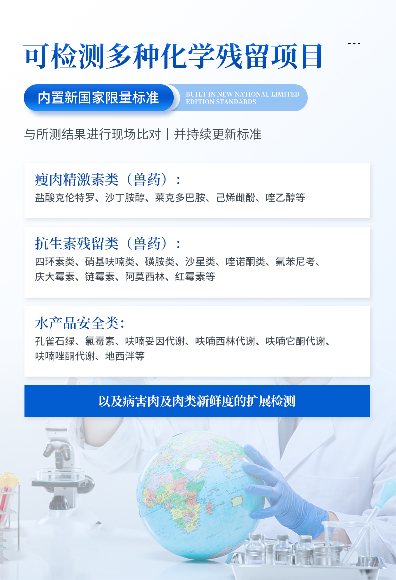 抗生素殘留檢測儀可現(xiàn)場快速檢測多類別抗生素類殘留,如可快速檢測四環(huán)素類、硝基呋喃類、磺胺類、沙星類、喹諾酮類、氯霉素、慶大霉素、鏈霉素、喹乙醇代謝物、硫酸鏈霉素、羧芐青霉素、噻孢菌素鈉、阿莫西林、氨芐西林、紅霉素、潮霉素B、安普霉紊、桿菌肽、氨丙琳、芐青霉家、頭孢噻呋、克拉維酸、氯羥吡啶、阿散酸等抗生素快速檢測;水產(chǎn)獸藥:呋喃妥因代謝、呋喃西林代謝、呋喃它酮代謝、呋喃唑酮代謝、孔雀石綠等。