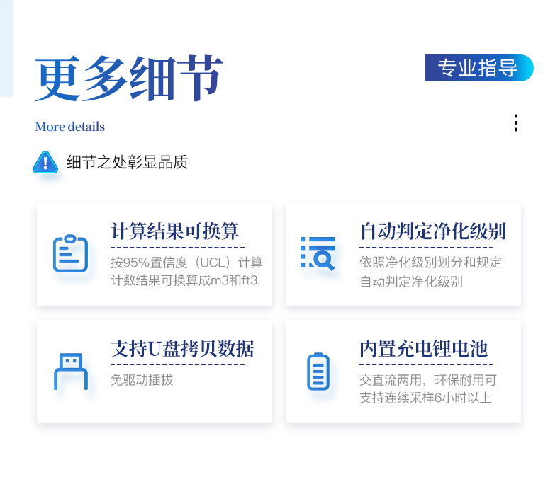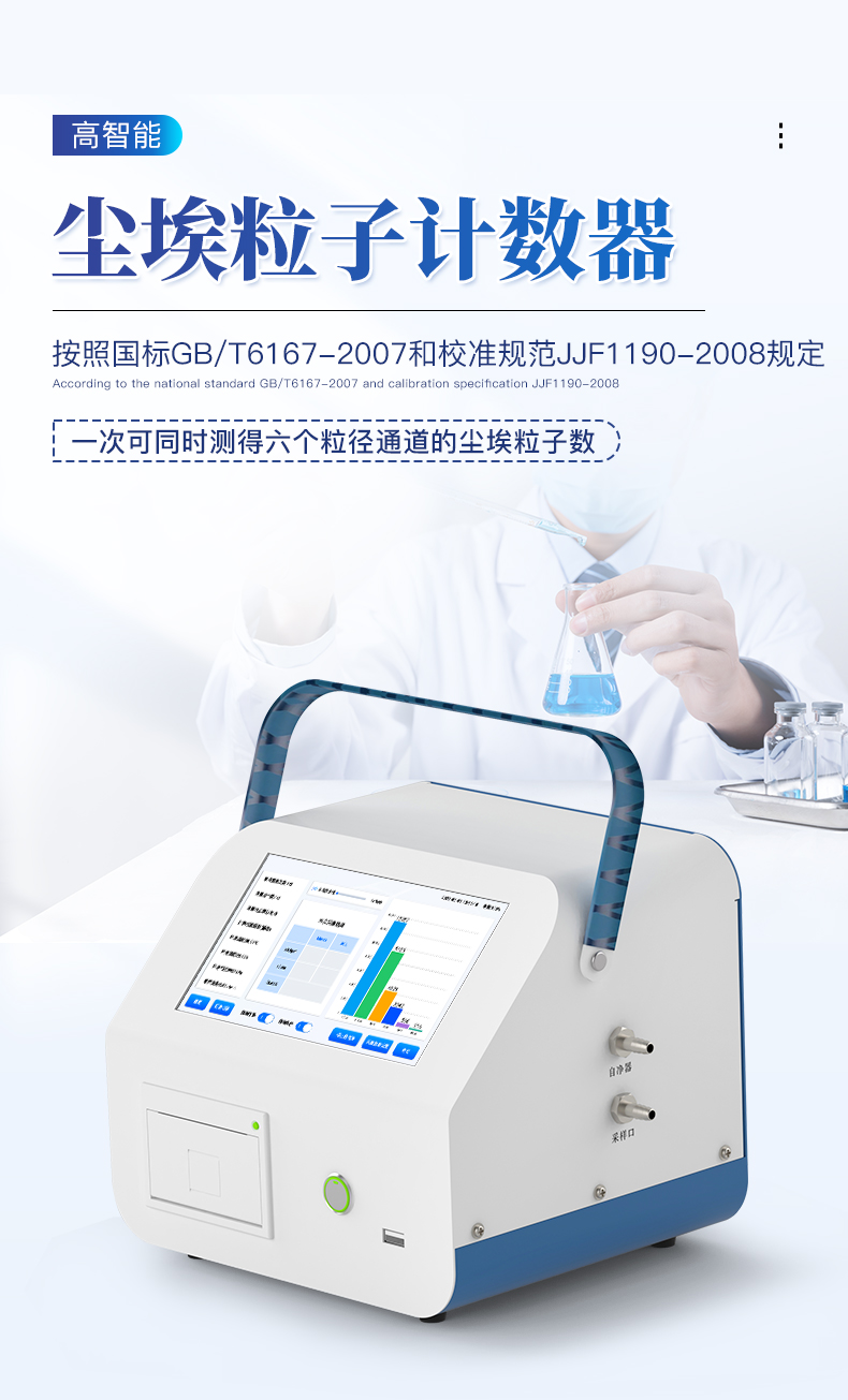 智能塵埃粒子計數(shù)器,其置信度測量檢定標(biāo)準(zhǔn)按照國標(biāo)GB/T6167-2007和校準(zhǔn)規(guī)范JJF1190-2008規(guī)定的條件,對凈化級別進(jìn)行自動判斷。一次采樣可同時測得六個粒徑通道的塵埃粒子數(shù),并同時顯示六個粒徑通道粒子的數(shù)目及其變化情況。