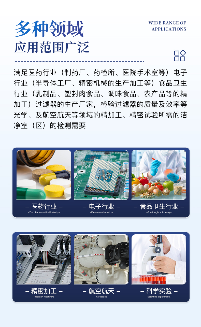 滿足醫(yī)藥行業(yè)(制藥廠、藥檢所、醫(yī)院手術(shù)室等);電子行業(yè)(半導(dǎo)體工廠、精密機械的生產(chǎn)加工等);食品衛(wèi)生行業(yè)(乳制品、塑封肉食品、調(diào)味食品、農(nóng)產(chǎn)品等的精加工);過濾器的生產(chǎn)廠家,檢驗過濾器的質(zhì)量及效率等;光學(xué)、及航空航天等領(lǐng)域的精加工、精密試驗所需的潔凈室(區(qū))的檢測需要。