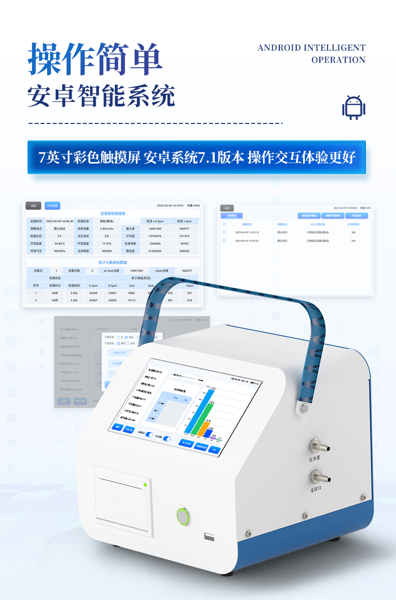 1、安卓系統(tǒng)7.1版本,操作交互體驗更好。 2、內(nèi)置溫濕度傳感器、環(huán)境氣壓傳感器 3、核心部件光散射傳感器明顯消除腔體的雜散光,信噪比大為提高。從而使測量更準(zhǔn)確更可靠。 4、按95%置信度(UCL)計算,計數(shù)結(jié)果可換算成m3和ft3 5、依照凈化級別劃分和規(guī)定,自動判定凈化級別,使用便利。 6、支持wifi、藍(lán)牙傳輸,數(shù)據(jù)可無線上傳;同時支持U盤拷貝數(shù)據(jù),免驅(qū)動插拔。 7、配置監(jiān)管平臺,檢測結(jié)果可直接無線傳至平臺,進(jìn)行潔凈度長短期分析,輔助管理。 8、內(nèi)置新一代高速熱敏打印機,可選擇所需要打印的粒徑通道,靈活打印結(jié)果。 9、交直流兩用,內(nèi)置充電鋰電池,環(huán)保耐用可支持連續(xù)采樣6小時以上。 10、便捷簡易伸縮式云臺支架,安裝采樣操作更加方便。