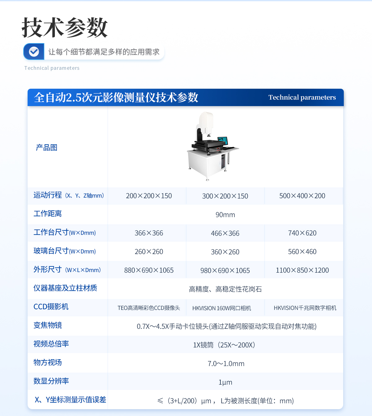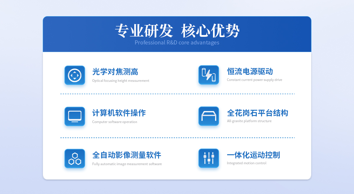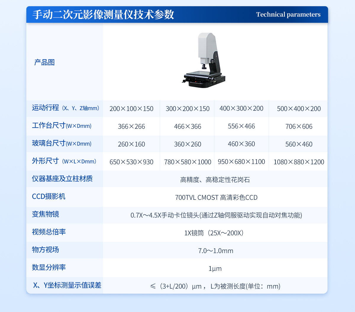 | 儀器基座 精磨高精度高穩(wěn)定性硬質(zhì)鑄鋁 1套 | CCD 700TVL模擬信號(hào)高清彩色CCD(COMST) 1個(gè) | 鏡頭 0.7~4.5 X連續(xù)變焦鏡頭 1個(gè) | 光柵尺 高精度位移傳感電子尺,分辨率:1μm (精微) 2條 | 導(dǎo)軌 咸陽(yáng)藍(lán)博P級(jí)精密交叉導(dǎo)軌(LB) 3組 | 傳動(dòng) 西德無(wú)牙光桿精密傳動(dòng)(西德) 3條 | 表面光源 LED恒流環(huán)形驅(qū)動(dòng)光源 (兩環(huán)一區(qū)) 1個(gè) | 底光源 LED白色恒流底光源 1PCS | 數(shù)據(jù)采集卡 DC3000 1PCS | 視頻采集卡 視頻采集卡 1PCS | 影像測(cè)量軟件 DTV 2.5T手動(dòng)影像測(cè)量軟件 1套 | 光學(xué)校正片 DTV 定制 1塊 | 電壓 AC :100-240V(全電壓) 1個(gè) |