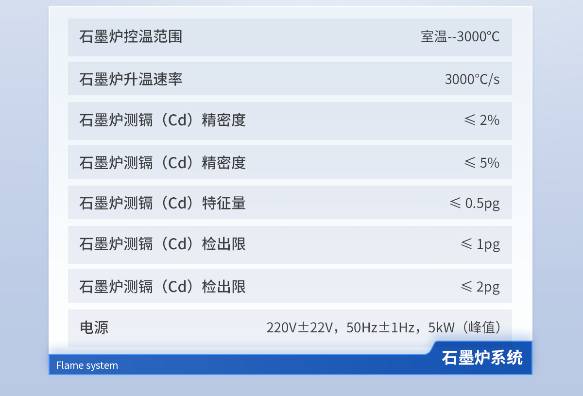 整機單色器類型:切爾尼-特納型(Czerny-Turner) 波長范圍:190nm~900nm 波長準確度:±0.25nm 波長重復性:< 0.05nm 光譜帶寬:0.1/0.2/0.4/0.7/1.4 nm 五檔自動切換 火焰系統(tǒng) 精密度:< 0.8%(火焰法測銅) 檢出限:< 0.008ug/mL 特征濃度:< 0.025μg/ml/1%(火焰法測銅) 靜態(tài)穩(wěn)定性: 0.003 Abs(static) 動態(tài)穩(wěn)定性: 0.004 Abs(dynamic) 石墨爐系統(tǒng) 石墨爐控溫范圍:室溫--3000℃ 石墨爐升溫速率:3000℃/s 石墨爐測鎘(Cd)精密度:≤ 2% 石墨爐測鎘(Cd)精密度:≤ 5% 石墨爐測鎘(Cd)特征量:≤ 0.5pg 石墨爐測鎘(Cd)檢出限:≤ 1pg 石墨爐測鎘(Cd)檢出限:≤ 2pg 電源:220V±22V,50Hz±1Hz,5kW(峰值)