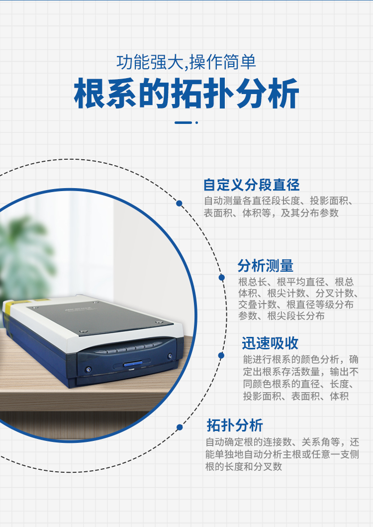 WinRHIZO軟件可以讀取TIFF,JPEG標(biāo)準(zhǔn)格式的圖像。針對(duì)獲取的圖像,利用插入加密狗解密的軟件,同時(shí)配合廠家針對(duì)掃描儀配置的Scanner.cal校準(zhǔn)文件,對(duì)掃描獲得的高質(zhì)量根系圖像進(jìn)行分析。采用非統(tǒng)計(jì)學(xué)方法測(cè)量計(jì)算出交叉重疊部分根系長(zhǎng)度、直徑、面積、體積、根尖等基本的形態(tài)學(xué)參數(shù);利用軟件的色彩等級(jí)分析功能,還可以對(duì)根系顏色進(jìn)行分析,從而進(jìn)行根系存活數(shù)量、根系生長(zhǎng)和營(yíng)養(yǎng)狀況等方面研究;利用軟件的**分析功能,還可以對(duì)完整的植物根系圖像進(jìn)行根系連接分析(研究根系分支角度、連通性等形態(tài)特征)、根系拓?fù)浞治?研究根系連接數(shù)量、路徑長(zhǎng)度)和根系分級(jí)伸展分析(記錄根系整體等級(jí)分布情況)。從而滿足研究者針對(duì)植物根系不同類別和層次的研究。