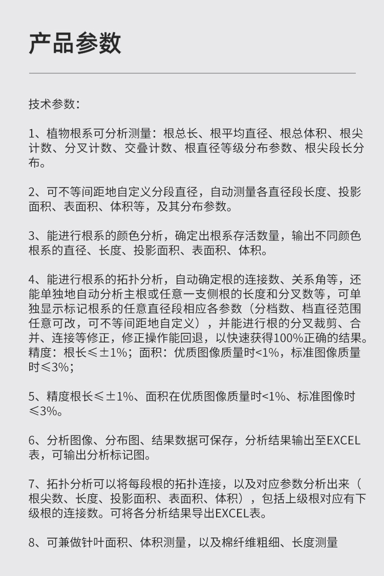 1、 圖像撲捉系統(tǒng):經(jīng)過(guò)廠家調(diào)試的標(biāo)準(zhǔn)根系掃描設(shè)備,匹配專門的光源、具有持續(xù)校正特點(diǎn)、根系固定裝置等
